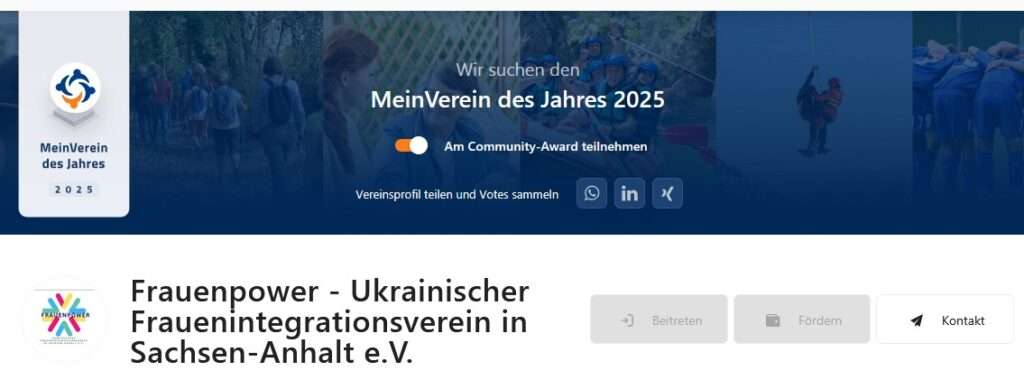 Ми беремо участь у громадському конкурсі на звання «Мій клуб року 2025» від MeinVerein. Ви можете щодня віддавати один голос за наш клуб за наступним посиланням, щоб підвищити обізнаність про нашу роботу та підтримати нас у виборах «Мій клуб року 2025». Будь ласка, поширюйте інформацію, пересилайте посилання та голосуйте за наш клуб щодня: https://web.meinverein.de/profile/90883
